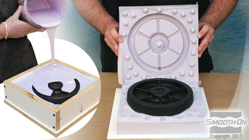 Pouring / Curing / Post Curing - For best results, pour your mixture in a single spot at the lowest point of the containment field. Let the rubber seek its level up and over the model. A uniform flow will help minimize entrapped air. The liquid rubber should level off at least 1/2” (1.3 cm) over the highest point of the model surface. Allow the mold to cure overnight (at least 16 hrs) at room temperature (73°F/23°C) before demolding. Post curing the mold an additional 4 hours at 150°F (65°C) will eliminate any residual moisture and alcohol that is a byproduct of the condensation reaction that can inhibit the cure of some urethane resins and rubbers. Allow mold to cool to room temperature before using. Do not cure rubber where temperature is less than 65°F/18°C.