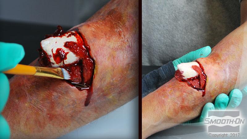 APPLYING... Ultimate Blood™ can be applied in various ways (depending on viscosity) including brushing it on with a chip brush, smearing it on with a popsicle stick or even drizzling or splashing it onto the surface. When the vicosity is thin, it can be sprayed through a dispenser for splatter effects.